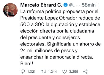 A través de su cuenta de Twitter, Ebrard Casaubón señaló: “La reforma política propuesta por el Presidente López Obrador reduce de 500 a 300 la diputación y establece elección directa por la ciudadanía del presidente y consejeros electorales. Significaría un ahorro de 24 mil millones de pesos y ensanchar la democracia directa. Bien!!”, escribió el canciller.