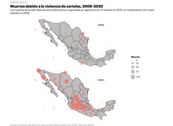 En 2006, las muertes por conflictos entre grupos criminales se contabilizaron en 669 casos, pero en 2020, las víctimas por esa causa aumentaron exponencialmente a 16 mil personas asesinadas.