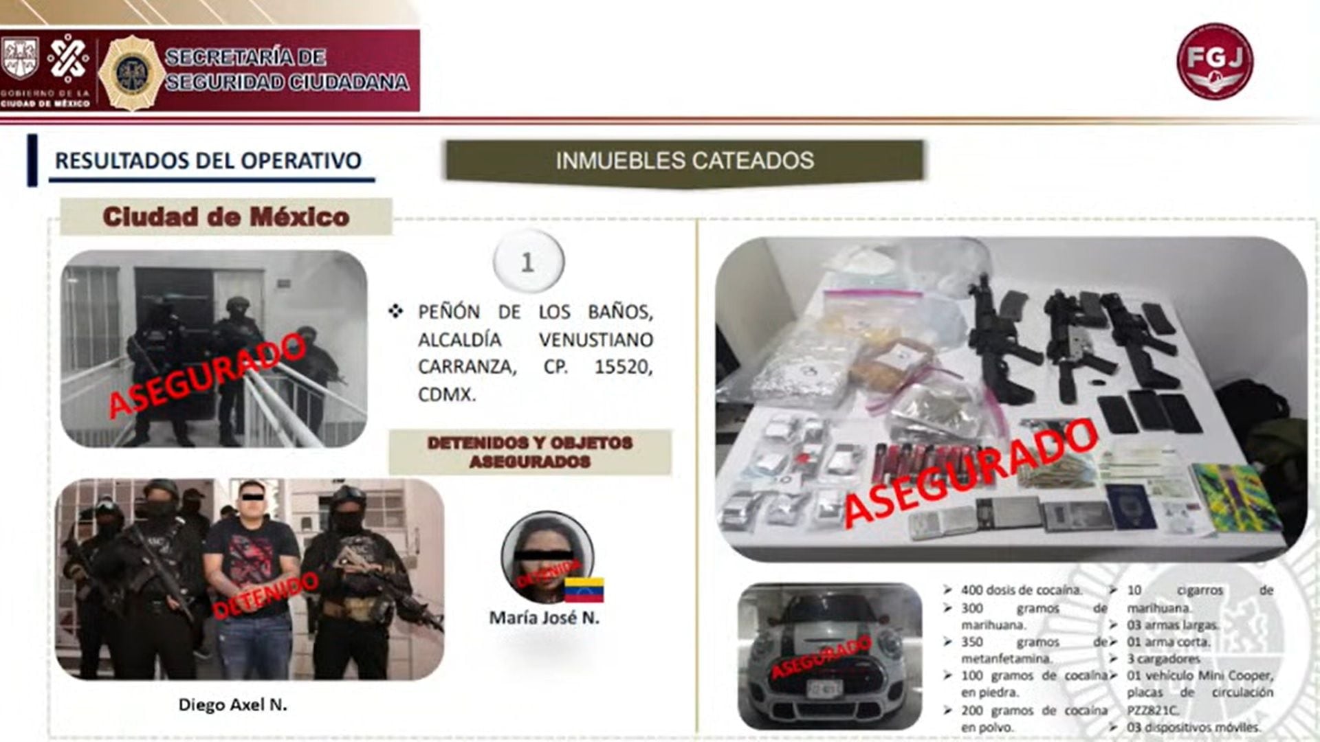Los otros detenidos son María Wendoline “N”, María José “N” de nacionalidad venezolana; así como Raúl “N”, Luis Fernando “N”, alias el Marcy; y Luis Gilberto, alias el Gil, Logan y/o el 11.
