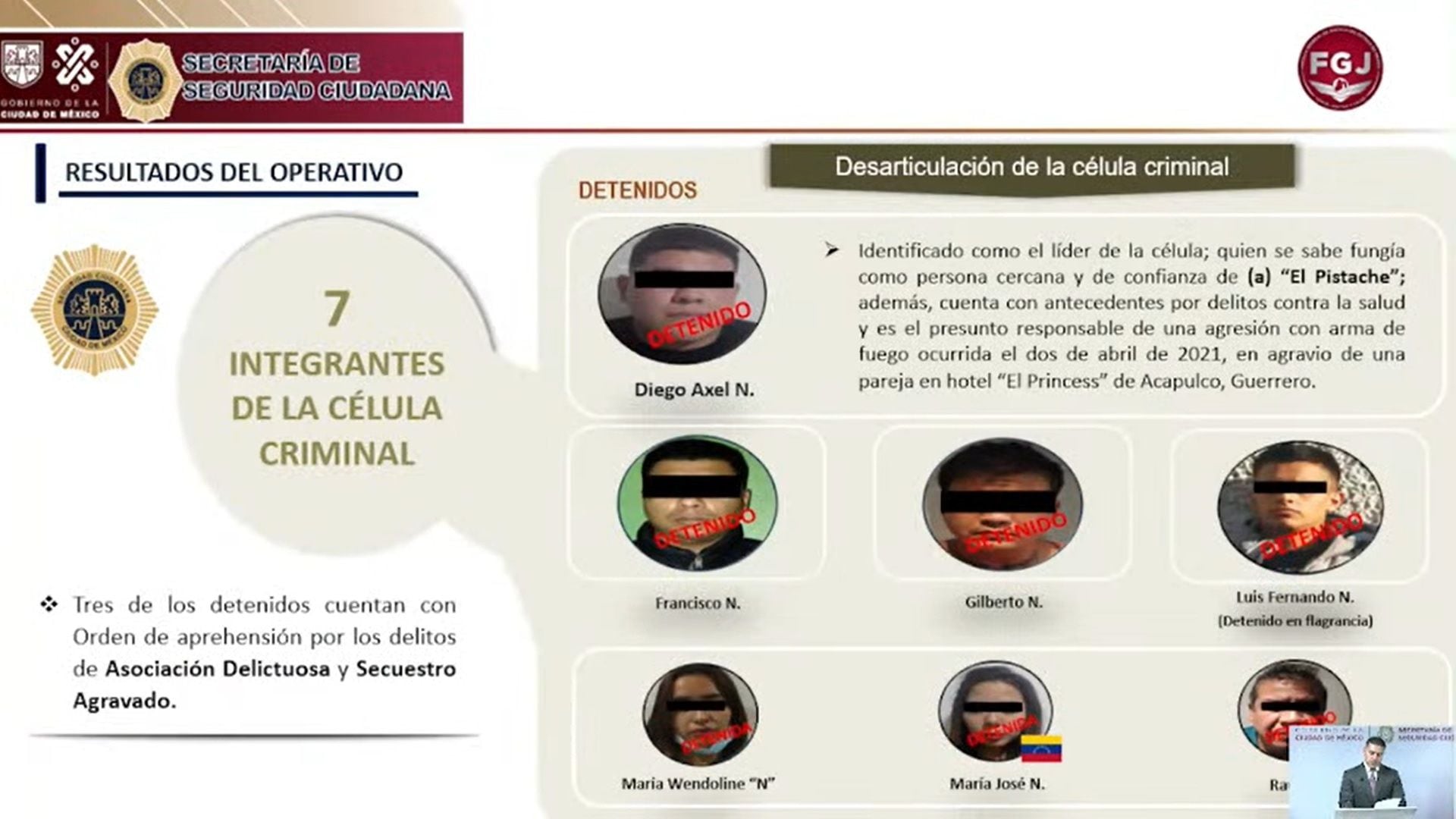 Omar García Harfuch, secretario de Seguridad de la Ciudad de México, presentó el informe de las detenciones y destacó que el Gordo es jefe de célula en el mismo nivel que otro sujeto conocido como Gilberto “N”. Ambos responden a las órdenes de Axel Esli “N”, quien tomó el lugar del Pistache, tras la detención de este cabecilla en 2018.