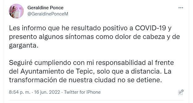 Durante la noche de este 16 de junio, la presidenta municipal de Tepic, Geraldine Ponce, informó que había dado positivo a una prueba de COVID-19, por lo que comenzaría a laborar a distancia mientras se recupera de la enfermedad.