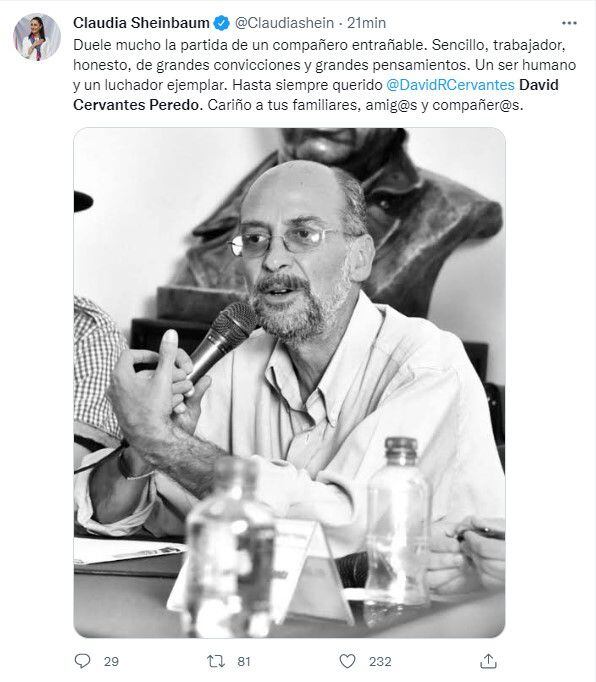 Tal fue el caso de la jefa de Gobierno de la Ciudad de México (CDMX), Claudia Sheinbaum Pardo, lamentó en su red social la partida de Cervantes Peredo, a quien, al igual que el presidente López Obrador, calificó de un hombre sencillo, honesto y trabajador.