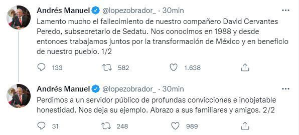 A través de su cuenta oficial de Twitter, el mandatario federal lamentó el fallecimiento de su colaborador, a quien calificó como un servidor público de “profundas convicciones” y con el que trabajó desde 1988.