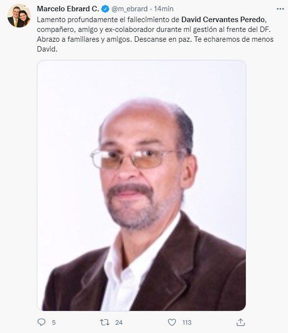 “Lamento profundamente el fallecimiento de David Cervantes Peredo, compañero, amigo y ex-colaborador durante mi gestión al frente del DF. Abrazo a familiares y amigos. Descanse en paz. Te echaremos de menos David”, escribió el canciller.