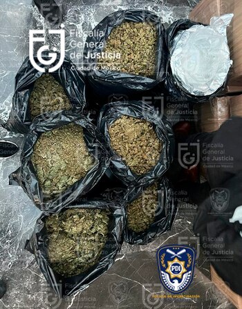 Ulises Lara López, vocero de la FGJCDMX, informó que fueron aseguradas al menos seis bolsas de plástico negro con el enervante, así como tres paquetes envueltos en cinta canela con la misma droga y 12 cajas que al interior contenían dosis del cannabis.