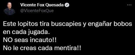 “Este lopitos tira buscapiés y engañar bobos en cada jugada. ¡NO seas incauto! ¡No le creas cada mentira!”, puntualizó el exmandatario, quien se ha posicionado como un férreo crítico a la actual administración.