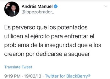 “Es perverso que los potentados utilicen al Ejército para enfrentar el problema de la inseguridad que ellos crearon por dedicarse a saquear” , escribió el tabasqueño el 19 de febrero de 2013.