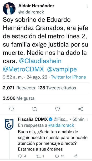 Los mensajes proliferaron y este miércoles 24 de agosto, Aldair Hernández, quien se identificó como sobrino de Eduardo Hernández, exigió justicia al tiempo que denunció que hasta el momento las autoridades no le habían dado la cara a los familiares de la víctima.