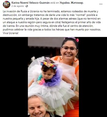 El 24 de febrero Karina Noemí Velasco Guzmán tenía a su bebé Ivanna de seis meses de nacida, ambas junto a su esposo y padre de la bebé se encontraban en Zhitómir, desde ese primer día de la invasión armada de Rusia a Ucrania. La psicóloga mexicana no ha pensado abandonar el país, decidió quedarse por su familia, pero ha sido testigo de las múltiples vejaciones y asesinatos a civiles y niños, incluso de la edad de su hija.
