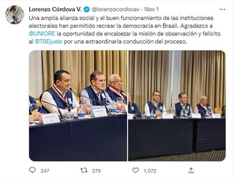 Córdova, quien fungió como observador internacional en el proceso electoral brasileño hace unos días, dijo que Bolsonaro intentó descalificar al Tribunal electoral de su país, de la misma manera que López Obrador lanza críticas al INE en México.