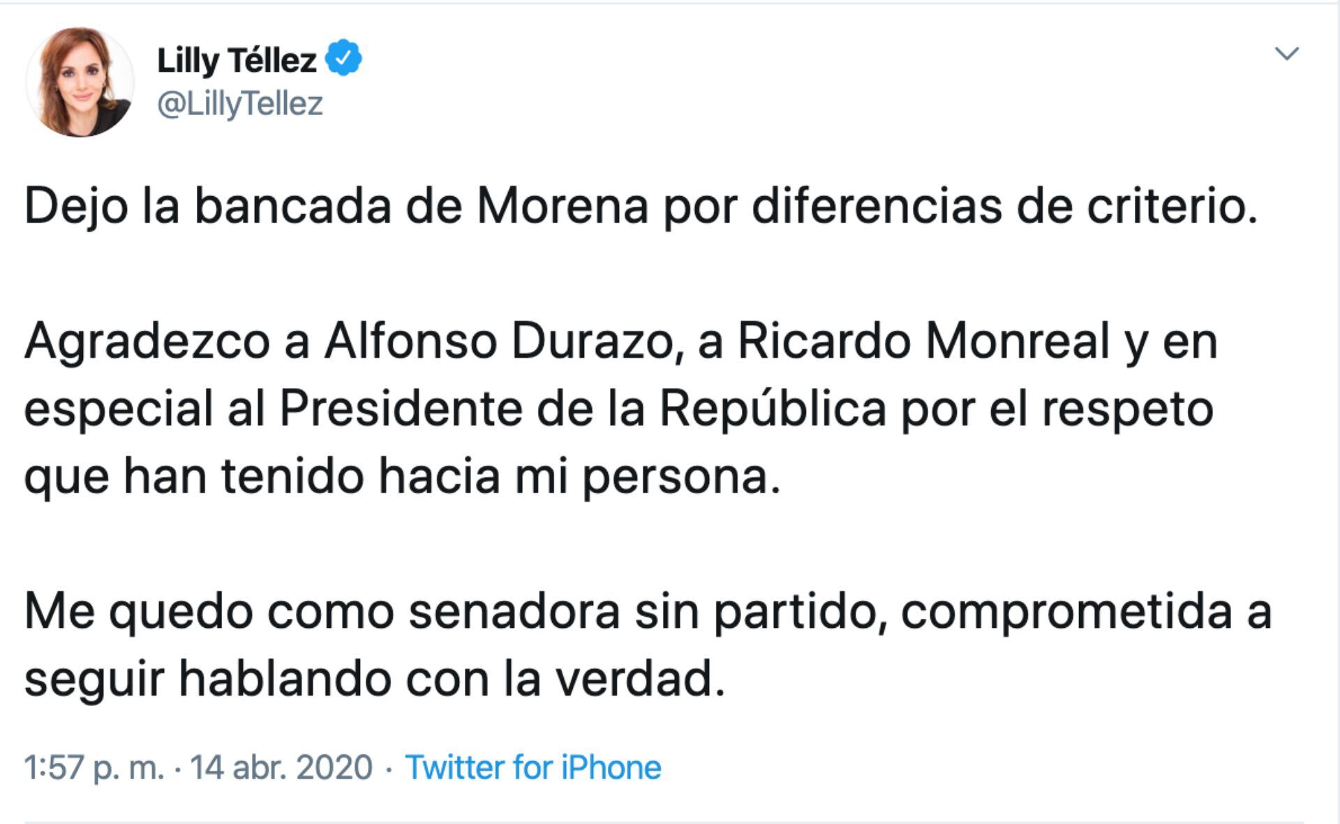 “Dejo la bancada de Morena por diferencias de criterio. Agradezco a Alfonso Durazo, a Ricardo Monreal y en especial al Presidente de la República por el respeto que han tenido hacia mi persona. Me quedo como senadora sin partido, comprometida a seguir hablando con la verdad.”, fue el breve mensaje con el que Téllez anunció su decisión de no continuar en consonancia con la 4T.
