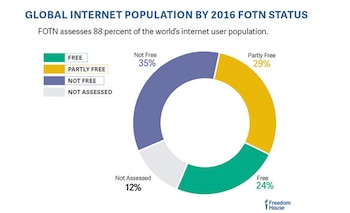 Según el reporte, el 35% de los usuarios de internet en el mundo viven en países que no son libres (puntajes superiores a 60), 29% en países que son parcialmente libres (entre 31 y 60 puntos) y sólo el 24% en países plenamente libres.