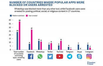 Entre los emergentes más claros del aumento de la censura en el mundo, Freedom House destaca que los gobiernos de 38 países encarcelaron personas por posteos que hicieron en las redes sociales, más del doble que en 2015. En 27 de esos casos, Facebook fue la plataforma utilizada. Pero también fueron arrestados usuarios por publicar cosas en WhatsApp, Twitter, YouTube, Telegram e Instagram.