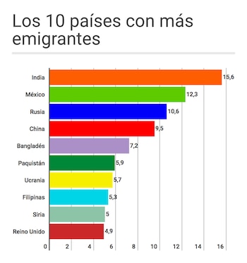 En total, en el mundo hay 244 millones de migrantes (41 por ciento más que en 2000). Según los datos del último International Migration Report de Naciones Unidas (del año 2015), los migrantes llegan en su mayoría de India (16 millones), México (12 millones), Rusia (11 millones) y China (10 millones).