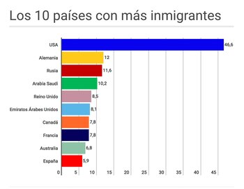 Entre los destinos favoritos Estados Unidos encabeza por lejos el primer lugar: 46,6 millones de personas de otros países viven allí. Seguido de Alemania (12 millones) y Rusia (11,6 millones), respectivamente.