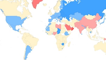 En el mapa, los países en azul son aquellos en los que las mujeres son mayoría; en los de rojo son mayoría los hombres; los que están pintados en amarillo tienen una cantidad parecida de ambos sexos.