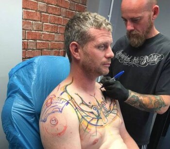 Kenny Ollerenshaw, como es conocido el hombre que decidió tatuarse, quería además que el nuevo diseño sobre su cuerpo fuera divertido. La parte inicial del trabajo le tomó cerca de cuatro horas al tatuador Richard Batey llevarlo acabo.