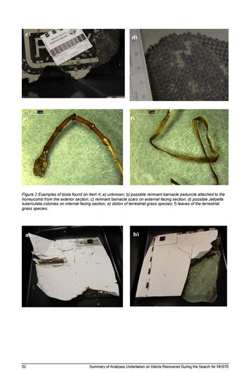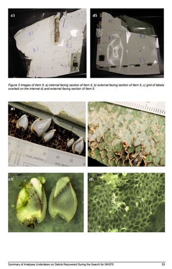 El reporte, detallado al extremo, muestra imágenes de los restos del avión que fueron encontrados en Mozambique, Sudáfrica y Mauritania. Desde caracoles hasta algas, todo fue analizado. En las fotografías identifican la macrofauna que se adhirió a las partes del avión y sirvieron a los investigadores y peritos determinar el tiempo que éstas permanecieron en las alas y de dónde eran originarias. Sin embargo, nada de ello sirvió para demostrar dónde pudo haber caído el Malaysia Arlines.
