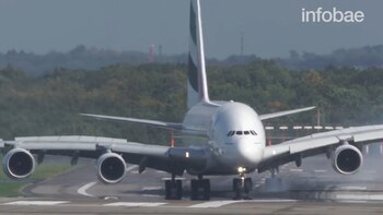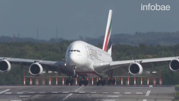 La cámara lo muestra flotando en el aire. A los pocos segundos, ya está mucho más cerca y a punto de tocar tierra. Recién en ese momento muestra la magnitud de su envergadura. Es un Airbus 380, el mayor avión comercial en actividad y perteneciente a la empresa Emirates.
