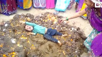 Una vez al año, lo niños pequeños son lanzados y refregados sobre una montaña de estiércol de vaca. Según la creencia local, ese rito les hará tener una vida saludable sin enfermedades y les traerá suerte a los pequeños.