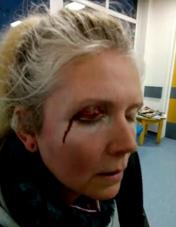 Cuando ingresó al hospital, la saboteadora presentaba un ojo negro severamente inflamado y ensangrentado.