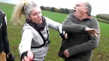 Otro miembro de la organización grabó el momento del ataque. En las imágenes se puede ver cómo el hombre se acercó a la señora y le ordenó agresivamente que dejara de filmar. Ante su negativa, el cazador la empujó al barro.