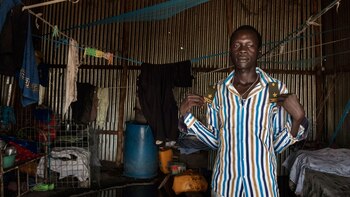 En la pequeña casilla donde vive, el joven no tiene prácticamente nada. Ni siquiera hay una cama. Pero conserva las jinetas que ganó en combate en la infancia. Tienen el acrónimo del Ejército de Liberación del Pueblo de Sudán y una estrella que indica llegó a ser teniente.