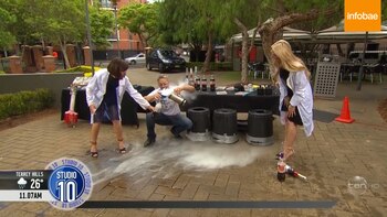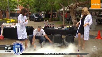 Una de las presentadoras del programa, Natarsha Belling, hizo de ayudante durante el experimento y sostuvo una de botella mientras Strickling la llenaba.