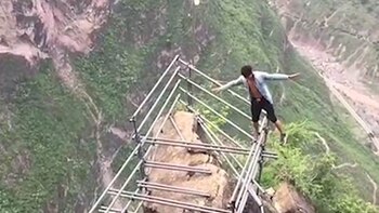 Las primeras imágenes muestran el escalofriante momento en que el equilibrista chino trastabilla y casi cae al precipicio. No obstante, logró recomponerse y finalizar con éxito la prueba.