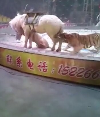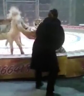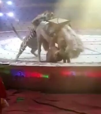 El terrible momento fue captado por una personas que se encontraba en el circo. En ellas se puede observar cómo el tigre se abalanza sobre la espalda del caballo blanco, mientras el león le muerde las patas.