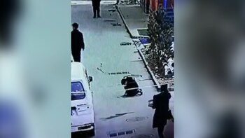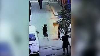 Se puede ver cómo el pequeño se agacha para encender algo que tiene en su mano sin percibir el escape de gas que proviene de la alcantarilla.