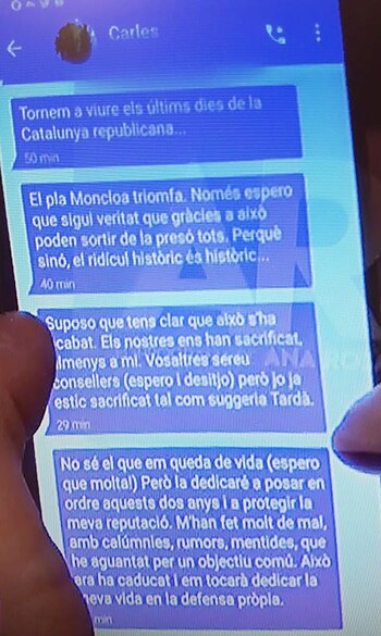 Los mensajes fueron difundidos por la cadena Telecinco, que asegura que fueron intercambiados entre el líder catalán y su ex consejero de Gabinete Toni Comín, quienes permenecen en Bruselas para evitar su detención, acusados por rebelión y sedición.