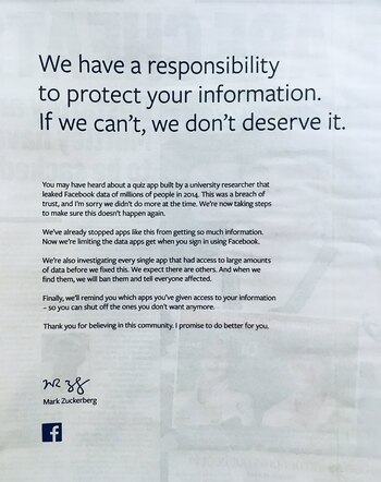 "Tenemos una responsabilidad: proteger sus datos. Si no lo logramos, no los merecemos", tituló Mark Zuckerberg en este mensaje publicado en la última página de los periódicos del domingo.