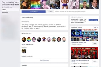 El grupo de Facebook que investigó Newsfeed, "Gay Houseboy's and those who hire them" ("Criados gays y aquellos que los contratan", aunque la palabra houseboy, que alude al empleado doméstico masculino, tiene también sentidos secundarios), se describe como "un grupo para hombres gays que buscan chicos gays que trabajen como empleados domésticos, y para empleados domésticos gays que busquen empleo". Pide que no se publiquen desnudos ni avisos de encuentros, "pero sus miembros ponen avisos que animan a los jóvenes a que cambien sexo por un lugar donde estar", denunció el artículo.