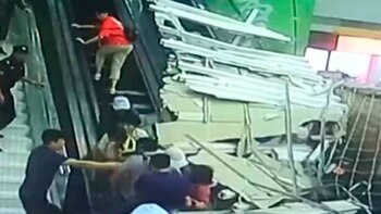 Las impactantes imágenes quedaron registradas por las cámaras de seguridad del lugar, y muestran a más de 10 personas que bajaban por las escaleras eléctricas, en ese momento, cuando el cielorraso colapsa y les cae encima.