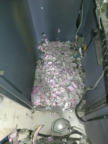 Según se podía ver en imágenes, el cajero estaba lleno de billetes de 500 a 2.000 rupias hechos trizas.