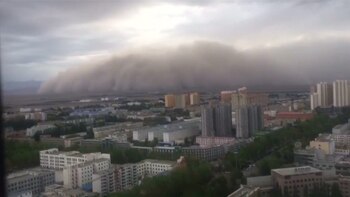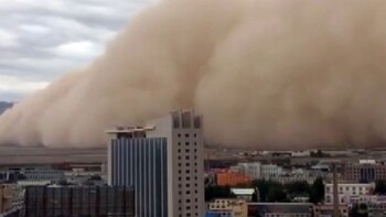 Una enorme tormenta de arena barrió este miércoles por la ciudad china de Golmu, tornando de amarillo el horizonte y oscureciendo el cielo en una imagen que parecía sacada de un relato bíblico.
