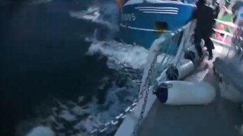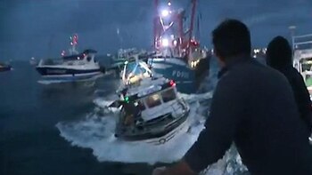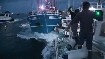 Una filmación del último estallido en una guerra de varios años sobre los preciados frutos de mar muestra cómo un pesquero embistió a otro, con un barco más pequeño atascado entre ellos, mientras los pescadores franceses arrojan piedras.