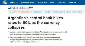 Los medios económicos internacionales destacan entre sus principales temas la caída que el peso argentino sufre este jueves por segundo día consecutivo, así como la fuerte alza de la tasa de interés por parte del Banco Central.