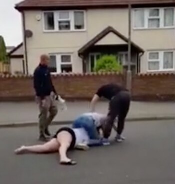 Entra al patio la que parece ser la pareja de Palmer y entonces las dos mujeres empiezan a darse golpes, primero dentro de la casa y luego en plena calle. Palmer intenta separarlas, caen al suelo y siguen golpeándose.