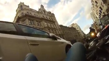 En ellas se puede observar cómo él avanza junto al tráfico por la calle New Bridge, en el centro de Londres, hasta que de repente una joven aparece entre dos autos para cruzar la calle.