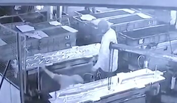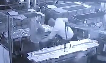 Un video de seguridad muestra el momento en que Rakesh Wagmore, supervisor de Aditya Jadhav, le apunta con la manguera de aire a los brazos y al pelo. No está claro si el motivo era quitarle el polvo o simplemente jugar con él.