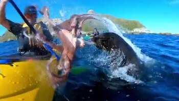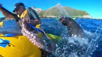 Las imágenes de una foca de Nueva Zelanda que golpea a un piragüista con un pulpo han causado furor en las redes sociales en las últimas horas.