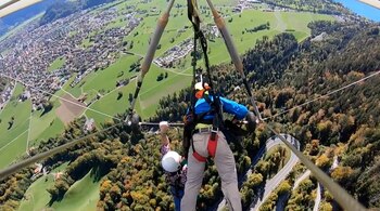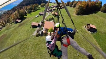 Un turista estadounidense de visita en Suiza se arriesgó a lanzarse por primera vez en ala delta, y tuvo que volar sujetándose con las manos porque al piloto se le olvidó enganchar su arnés al aparato.