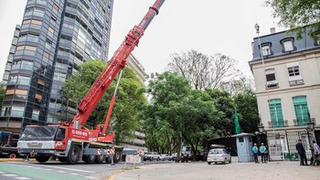 Ubicada en el exclusivo Barrio Norte, en Avenida Libertador 2141, esquina Ocampo, la Embajada se prepara para recibir a Bin Salman. Una enorme grúa roja ya está instalando vidrios blindados de color verde en todas las ventanas de la residencia. El objetivo es proteger al monarca de cualquier agresión… Es que el asesinato de Khashoggi y la intervención saudita en Yemen pueden traerle más de un problema legal en Buenos Aires.