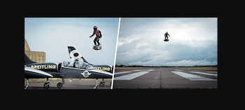Franky Zapata es un reconocido piloto profesional francés de motos acuáticas, que posteriormente se volvió empresario e inventor de Flyboard de propulsión acuática y posteriormente desarrolló su versión aeronáutica.