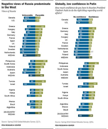 En contraste, la mayoría de los encuestados en América del Norte y en gran parte de Europa ven a Rusia bajo una luz negativa. En efecto, apenas una media regional del 27% en 10 países de la Unión Europea tiene una opinión favorable de Rusia, mientras que en Estados Unidos esta es del 21%.