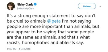 La cadena estadounidense CNN señaló que la publicación de PETA se realizó después que un académico de Reino Unido argumentara en noviembre que una mayor conciencia de los problemas veganos podría llevar a nuevos modos de expresión.