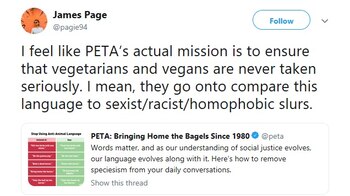 "Al igual que se volvió inaceptable utilizar un lenguaje racista, homofóbico o capaz, las frases que trivializan la crueldad hacia los animales se desvanecerán a medida que más personas comiencen a apreciar a los animales por lo que son y comiencen a 'llevar a casa los panecillos' en lugar del tocino", publicó PETA en su cuenta de Twitter, donde publicó una tabla con frases alternativas que no inciten a la crueldad animal.