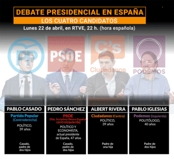 En la discusión participarán cuatro de los cinco principales candidatos: Pablo Casado (Partido Popular, centro-derecha), Albert Rivera (Ciudadanos, centro-derecha), Pablo Iglesias (Unidos Podemos, izquierda) y Pedro Sánchez (PSOE, centro-izquierda) quien es el actual presidente de España. Santiago Abascal, candidato del partido ultraderecha Vox, no podrá formar parte del panel luego de que la Junta Electoral confirmó que no cumple los requisitos que le fueron impuestos a Ciudadanos y Podemos hace cuatro años.